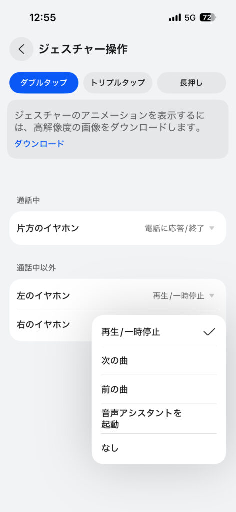 ↑ジェスチャー操作というところで左右のイヤホンの操作を選ぶ事が出来ます